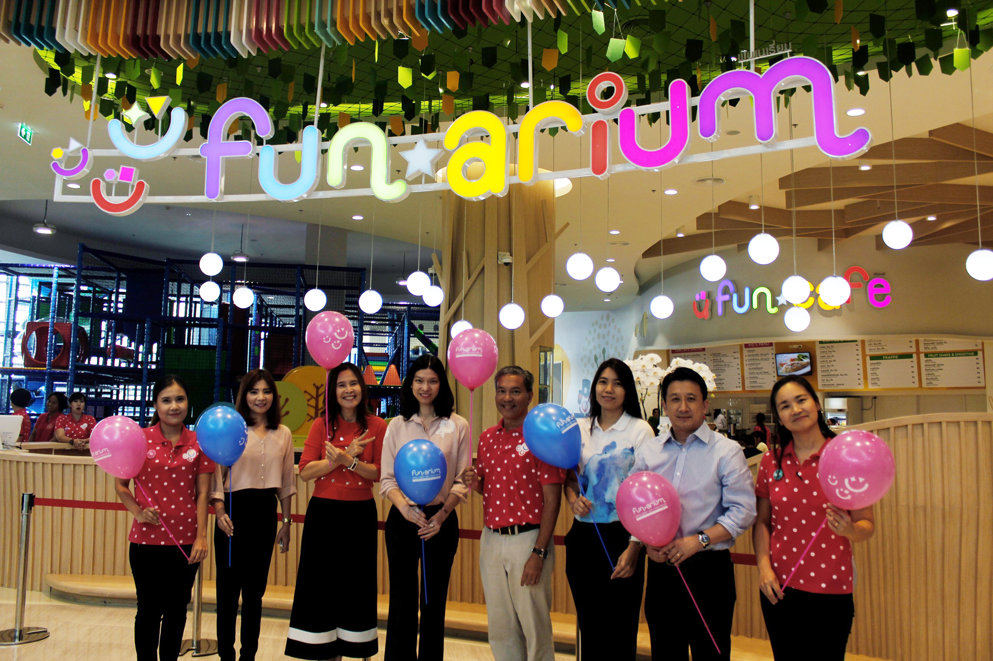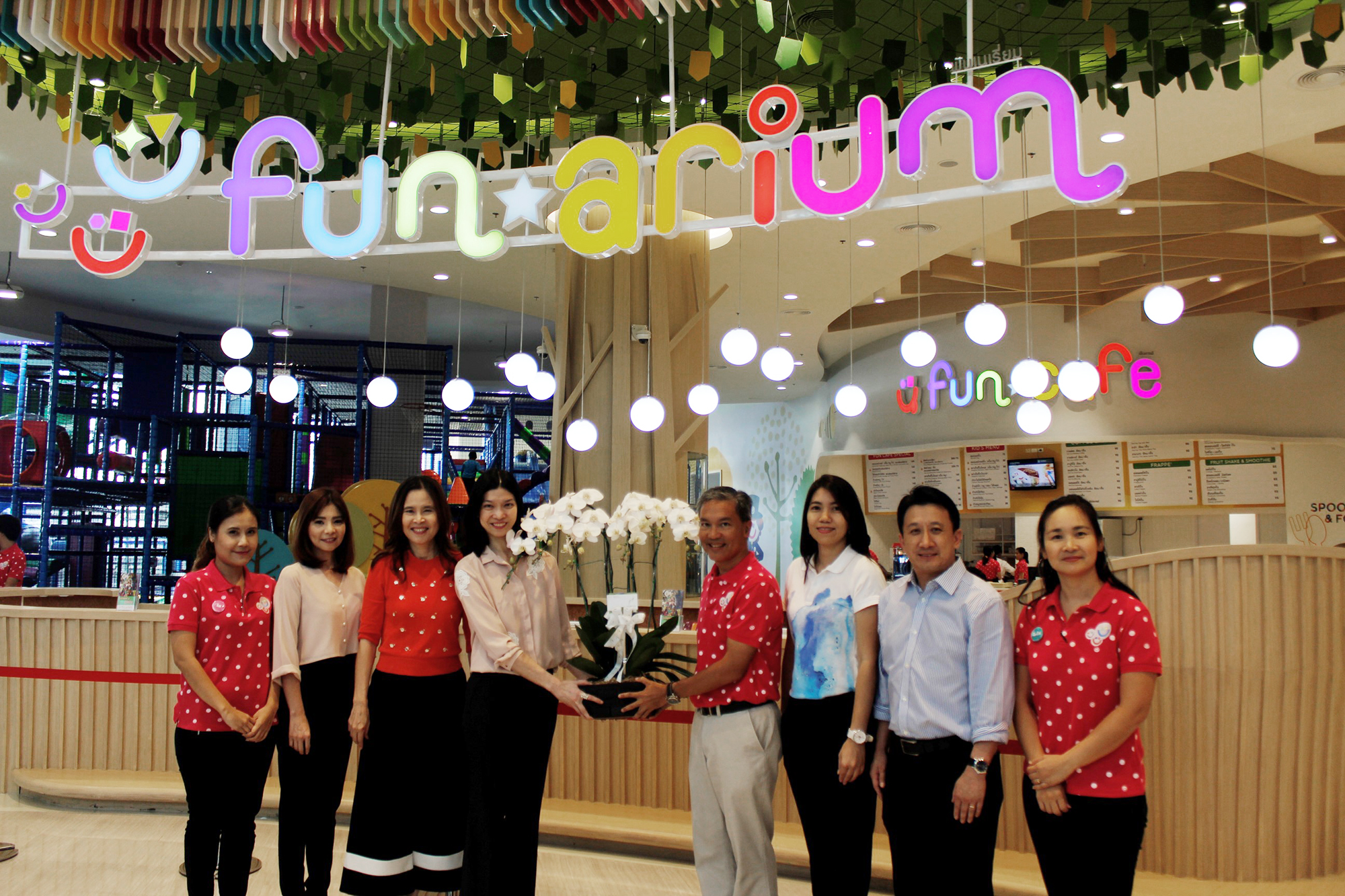 คุณจิตตินันท์ หวั่งหลี รองกรรมการผู้จัดการ สายพัฒนาธุรกิจและการตลาด และคุณรัตนา อนันทนุพงศ์ ผู้อำนวยการด้านการตลาด ศูนย์การค้าฟิวเจอร์พาร์ค มอบกระเช้าร่วมแสดงความยินดี FUNARIUM เนื่องในโอกาสที่เปิดสาขาใหม่ Playzene 3rd Fl., zone robinson.
