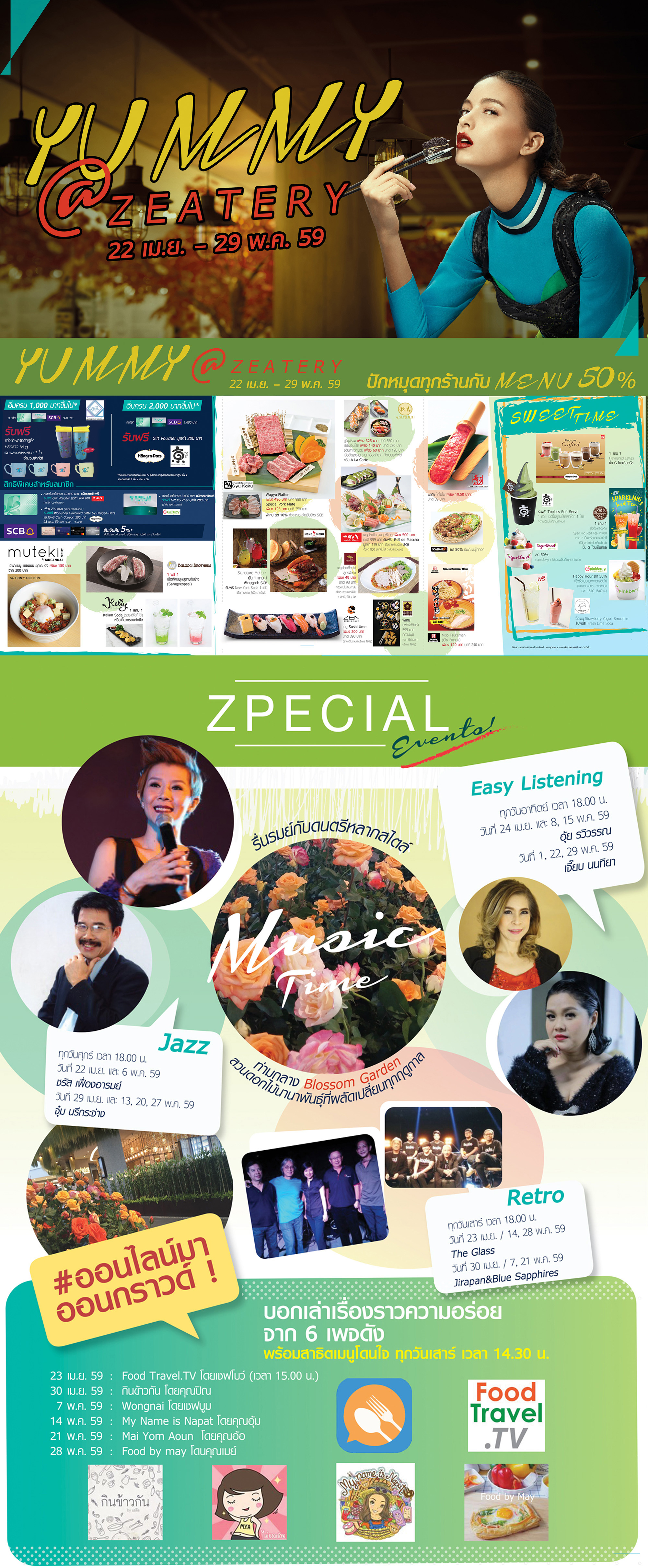 นอกจากร้านอาหารหลากหลายความอร่อยแล้ว บริเวณ Zeatery @ Zpell ยังได้ปรุงแต่งบรรยากาศโดยรอบด้วย Blossom Garden สวนดอกไม้นานาพันธุ์ที่ผลิบานหมุนเวียนเปลี่ยนไปตามมิติแห่งกาลเวลาในทุกฤดู และเสียงดนตรีหลากสไตล์ เพื่อสร้างประสบการณ์ที่ไม่ธรรมดาให้กับผู้ที่มองหาความแปลกใหม่ให้กับชีวิต โดยช่วงระหว่างวันที่ 22 เมษายน – 29 พฤาภาคม 2559 Zeatery @ Zpell ได้จัดโปรโมชั่นพิเศษ “Yummy @ Zeatery” ปักหมุดความอร่อยกับเมนูเด็ดในราคาลด 50% และเมื่อรับประทานครบ 1,000 บาทขึ้นไป รับฟรีแก้วน้ำภูฟ้าลายฝีพระหัตถ์ มูลค่า 120 บาท หรือรับประทานครบ 2,000 บาทขึ้นไป รับฟรี บัตรกำนัลHagen-dazs มูลค่า 200 บาท พร้อมชมการแสดงดนตรี Jazz, Retro, Easy Listening จากศิลปินชื่อดัง ชรัส เฟื่องอารมย์, นรีกระจ่าง คันธมาส, ระวิวรรณ จินดา, นนทิยา จิวบางป่า, Jirapan&Blue Sapphires, และ The Glass ที่สลับสับเปลี่ยนมาขับกล่อมทุกวันศุกร์, เสาร์ และอาทิตย์ (ตั้งแต่วันที่ 22 เมษายน – 29 พฤษภาคม 2559) บริเวณ Blossom Garden, Zeatery @ Zpell
